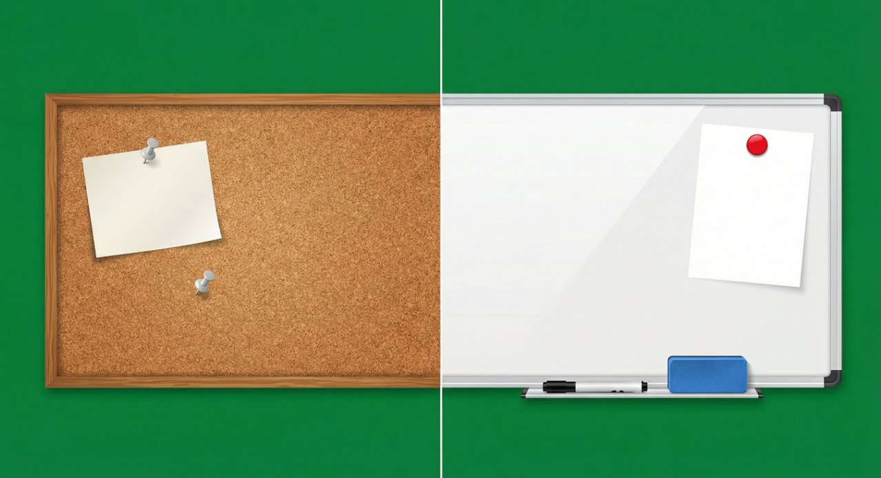 Для активных обсуждений выбирайте магнитно-маркерные доски, для статичного размещения новостей — пробковые.